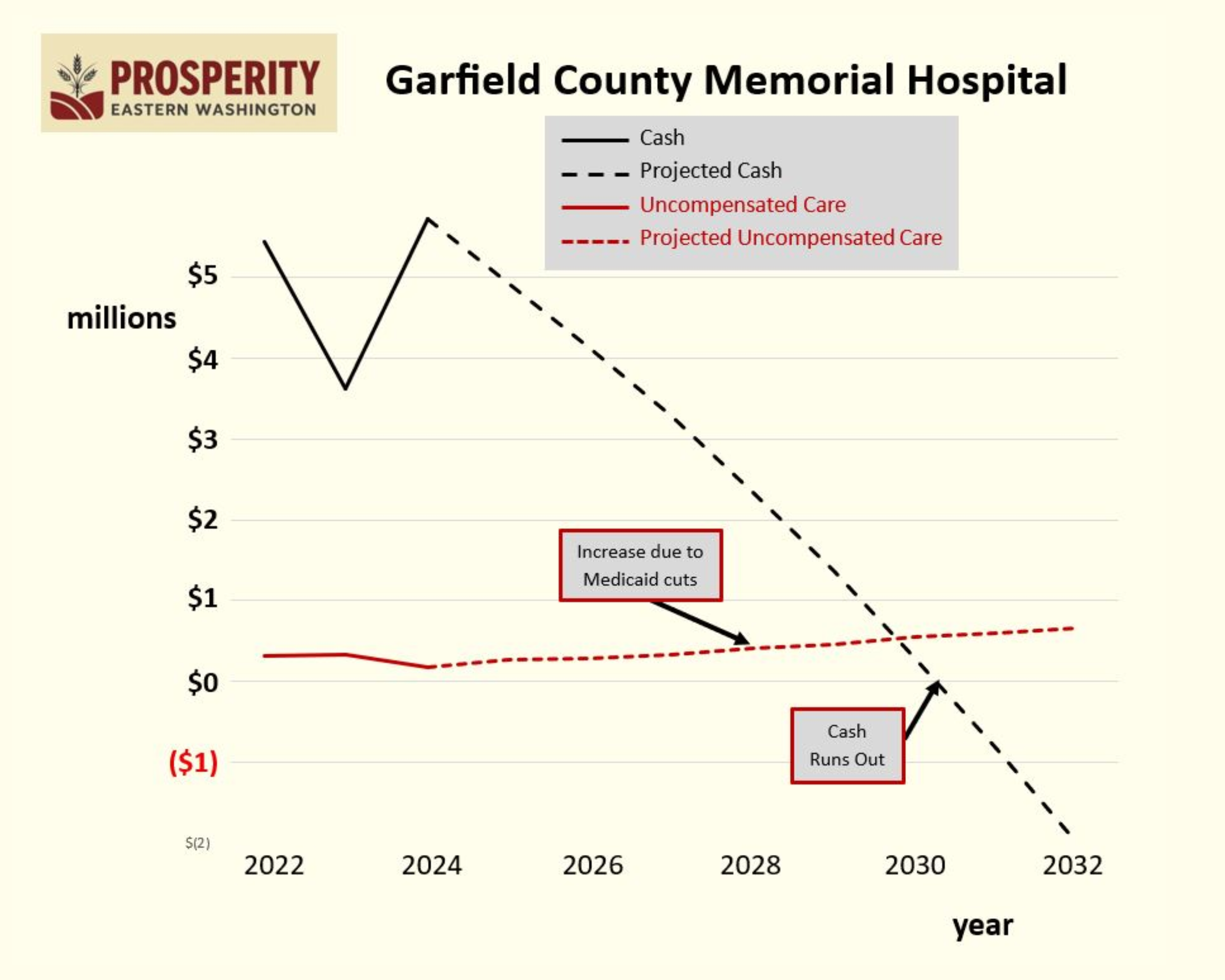 Without financial support, this graph shows that Garfield Hospital will be in the red in 2029.