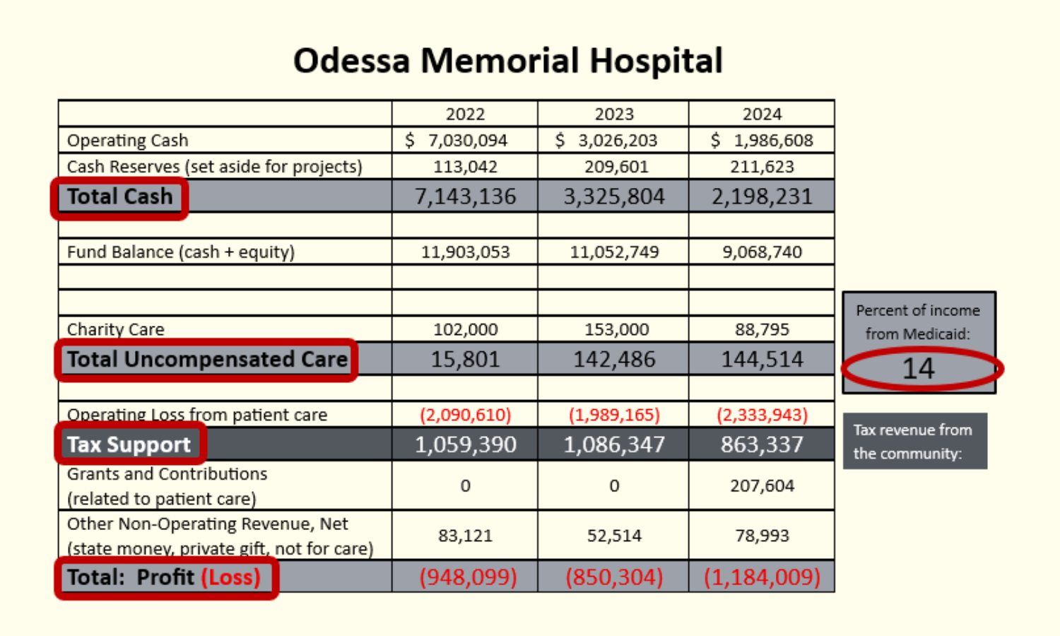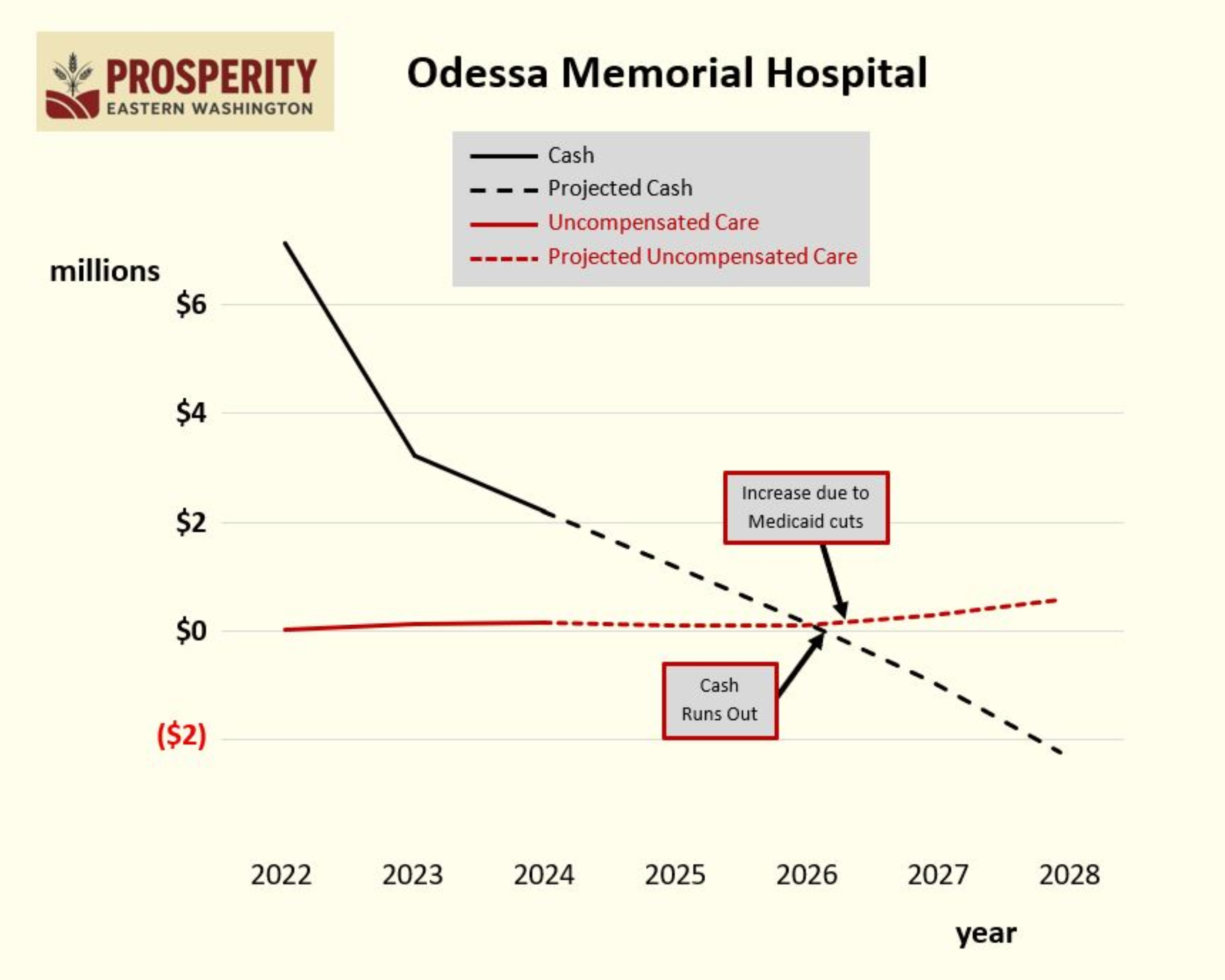 Without financial support, this graph shows that Odessa Hospital will be in the red in 2026.