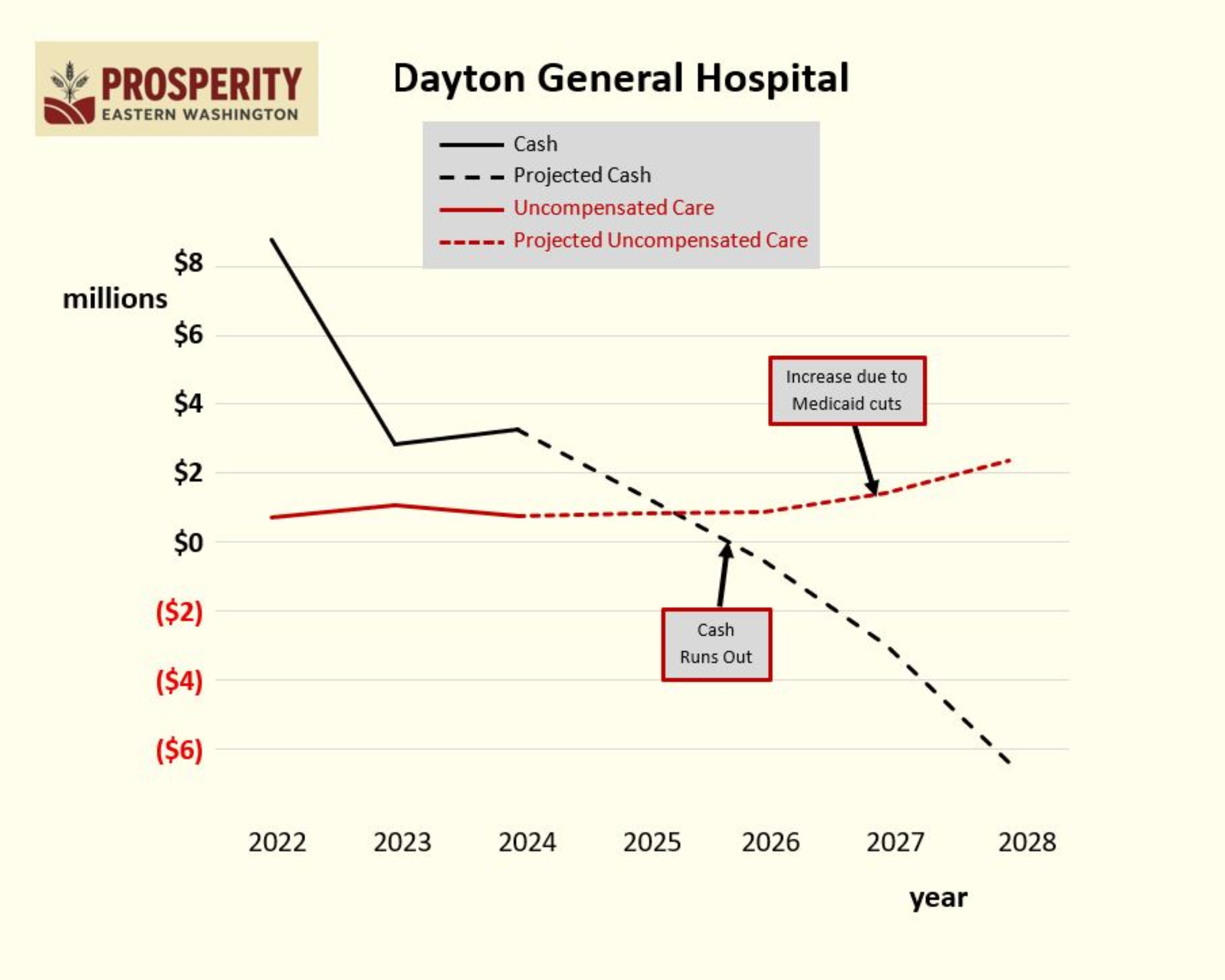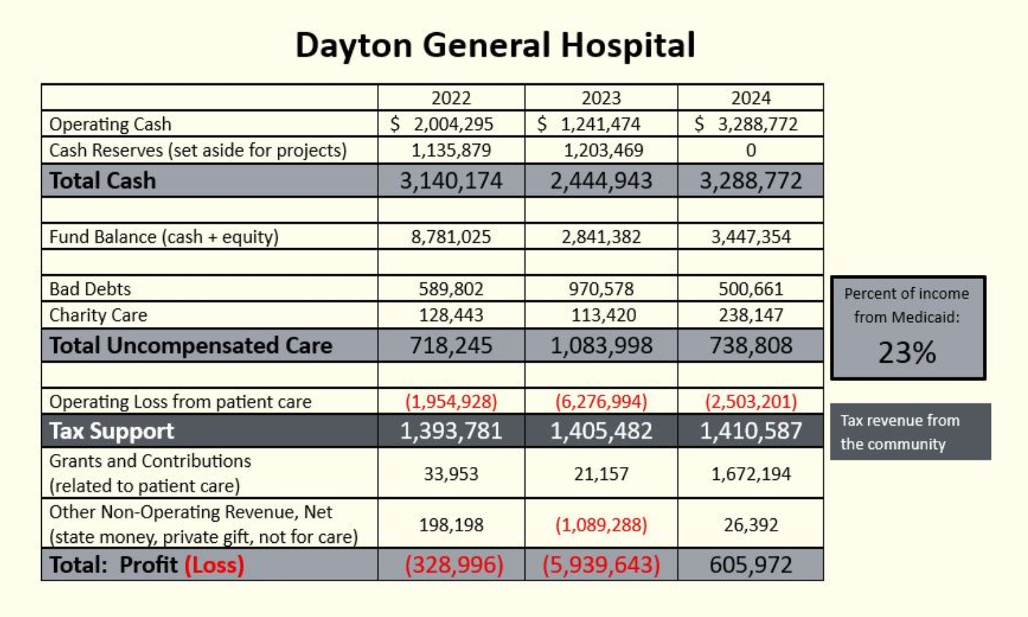 Without financial support, this graph shows that Dayton Hospital will be in the red in 2026.